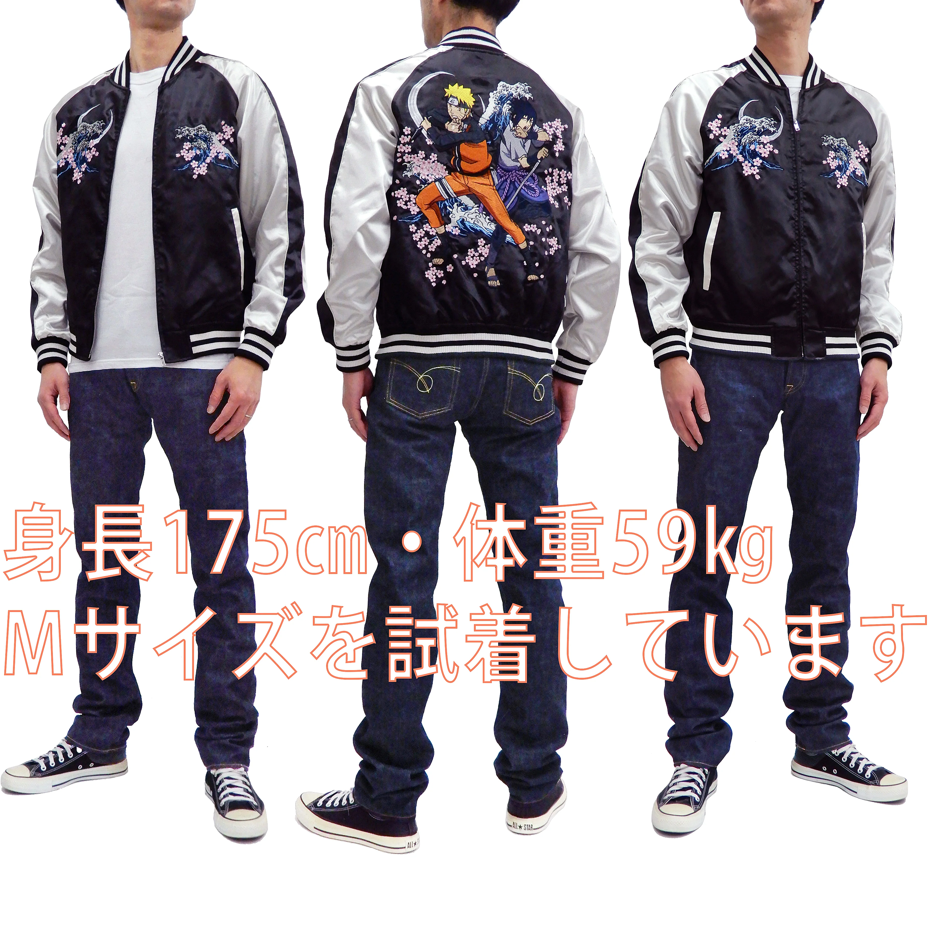 Model name: 9001821 Naruto Shippuden Men's Casual Fashion Embroidered Satin Jacket with Classical and Fashionable Forms of a Sukajan (Japanese Souvenir Jacket) / Mens Sukajan / Non-Reversible, No inside padding, Polyester satin, embroidered souvenir jacket for Men.