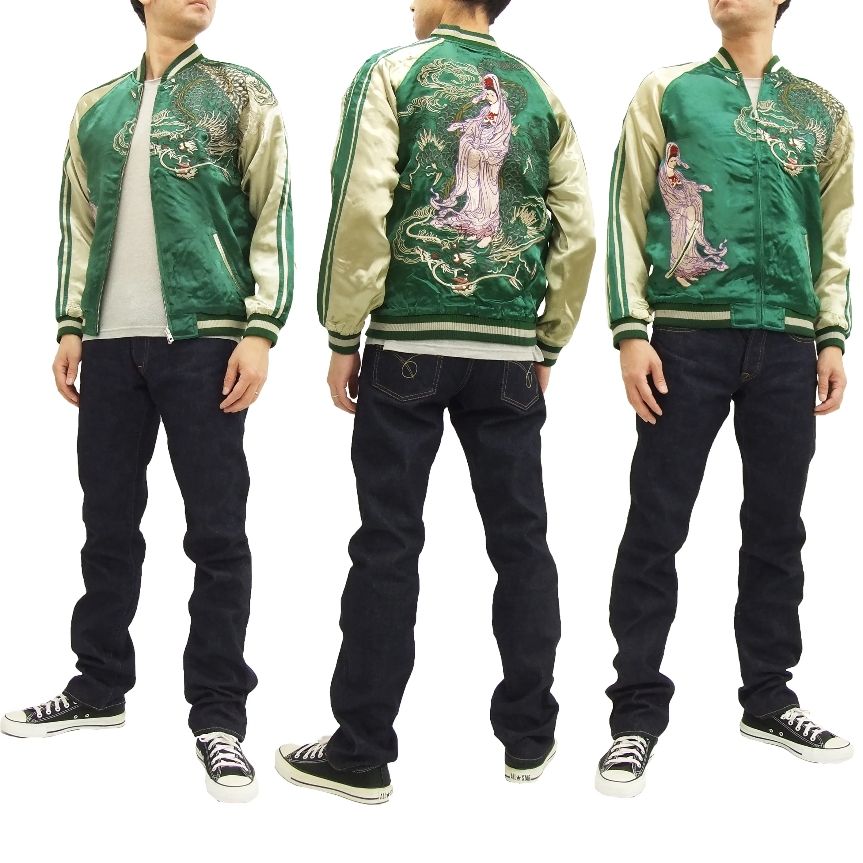 Satori Script Japanese Souvenir Jacket Guanyin Men's Sukajan GSJR-013 Green/Beigeâ