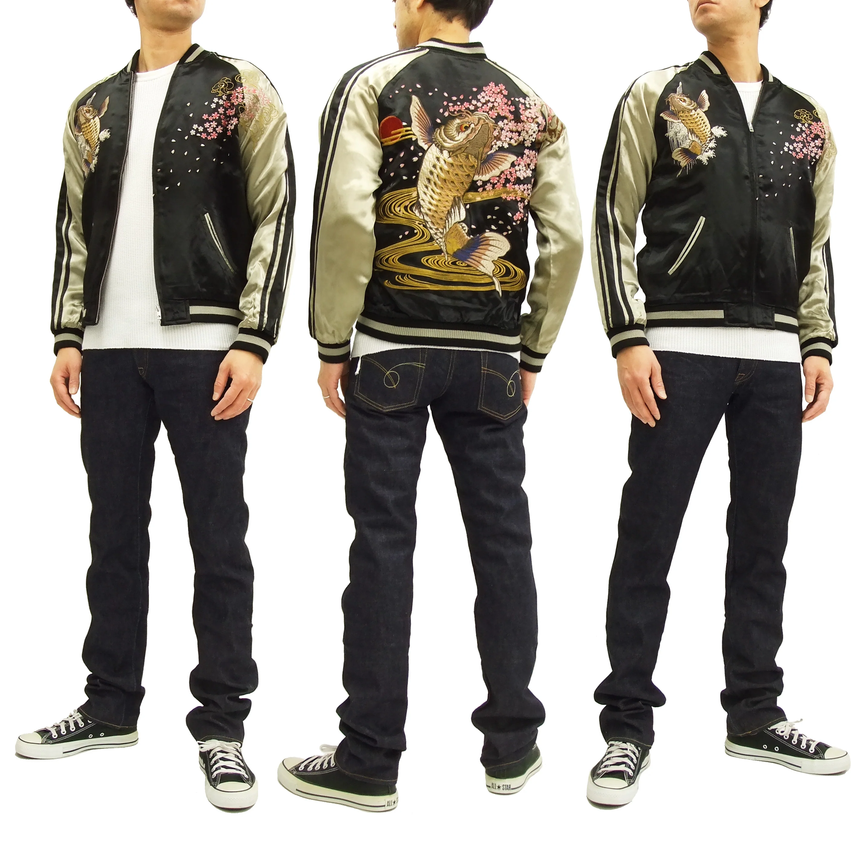 Satori Script Japanese Souvenir Jacket Koi Fish Carp Men's Sukajan GSJR-004 Black/Beige