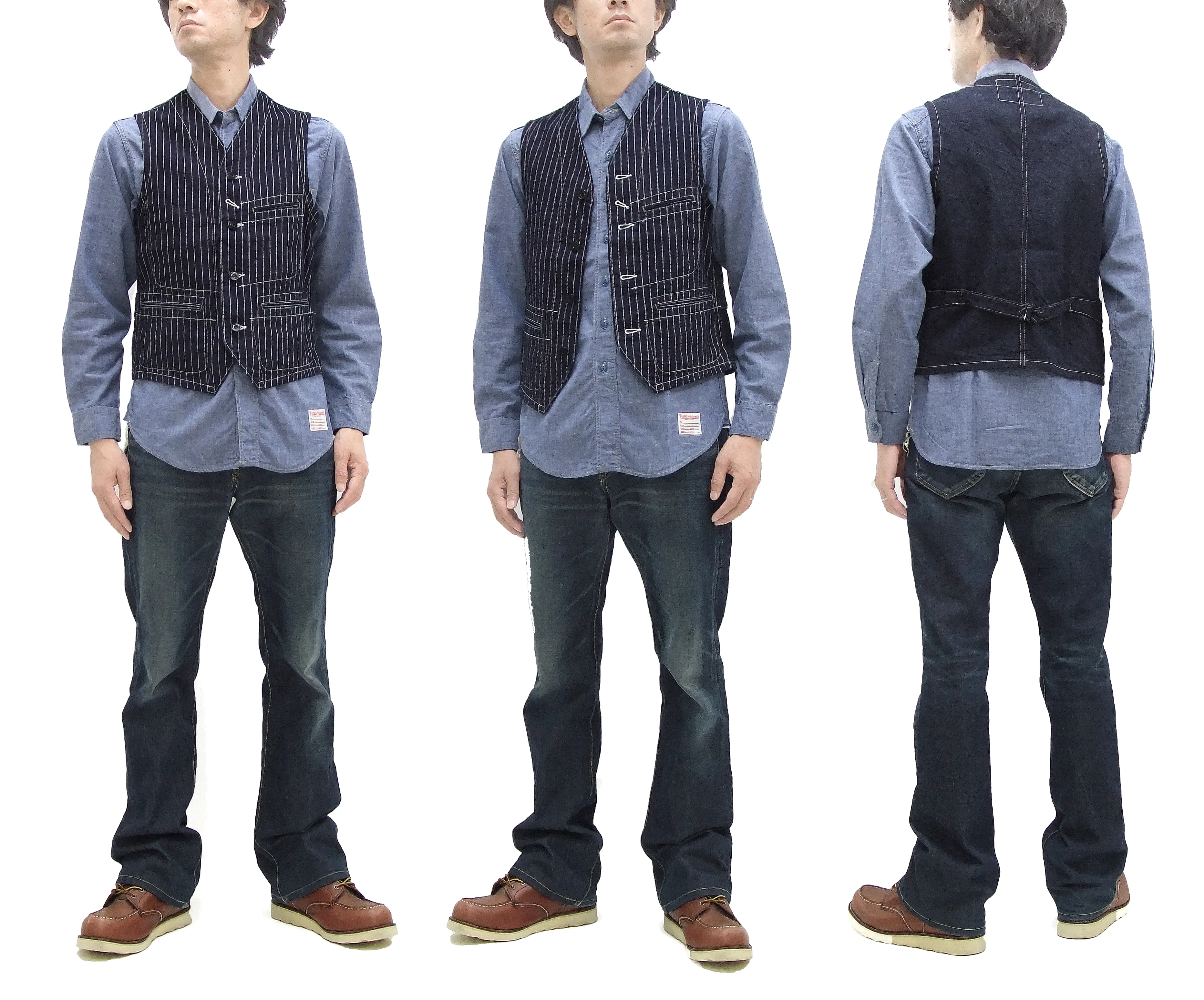 Model name : SC12654 Sugar Cane from Toyo Enterprises Men's Fashion Casual Vest with Classical and Fashionable Forms of Vintage Waistcoat (Workwear and Work Clothing) / Men's Waistcoat Vintage Style Wabash Stripe Work Vest For All Seasons / Unlined and Unfilled Year-Round Vest / Unpadded V Neck Button Down Vest, Non-padded V-Neck Button Up Vest / Indigo Dyed Wabash Striped Vest for a Casual Outfit / Button Front Vest Retro Work Waistcoat for Men / Lot No. SC12654 / 9oz. WABASH STRIPE WORK VEST.
