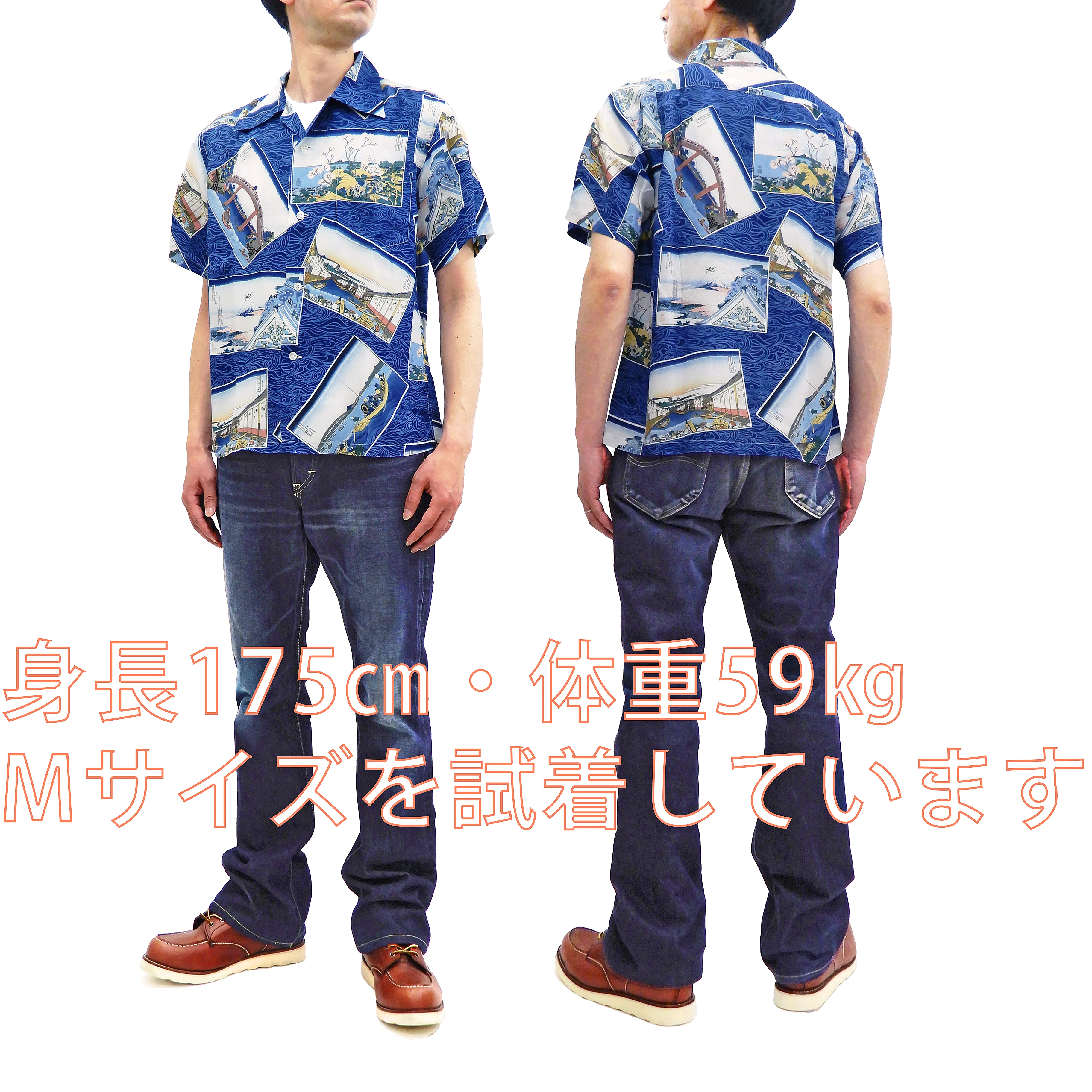 This Japanese hawaiian shirt is made in Japan and produced by Sun Surf from Toyo Enterprises. The Sun Surf label, a division of Toyo Enterprise in Japan, is famous around the world for its expertly-crafted authentic Aloha-style shirts. This product is made especially for Japanese market and made for Japanese clothing sizes. Body pattern is inspired by classic vintage aloha shirts, but this item is outfitted with the original details of Sun Surf brand in a contemporary approach. With the inspiration from classic Hawaiian shirts, this button up shirt has been re-designed for a fashion purpose. This shirt design is new original creations by Sun Surf and not reproductions of what once existed. The graphic on this shirt is based on the Views of Edo by the Japanese ukiyo-e artist Katsushika Hokusai. And the fabric is made from soft lightweight rayon woven and indigo-printed in Japan with traditional techniques. This shirt is a limited edition made by Sun Surf under the supervision of the Sumida Hokusai Museum. This modern hawaiian shirt is new original creations by Sun Surf from Toyo Enterprises.