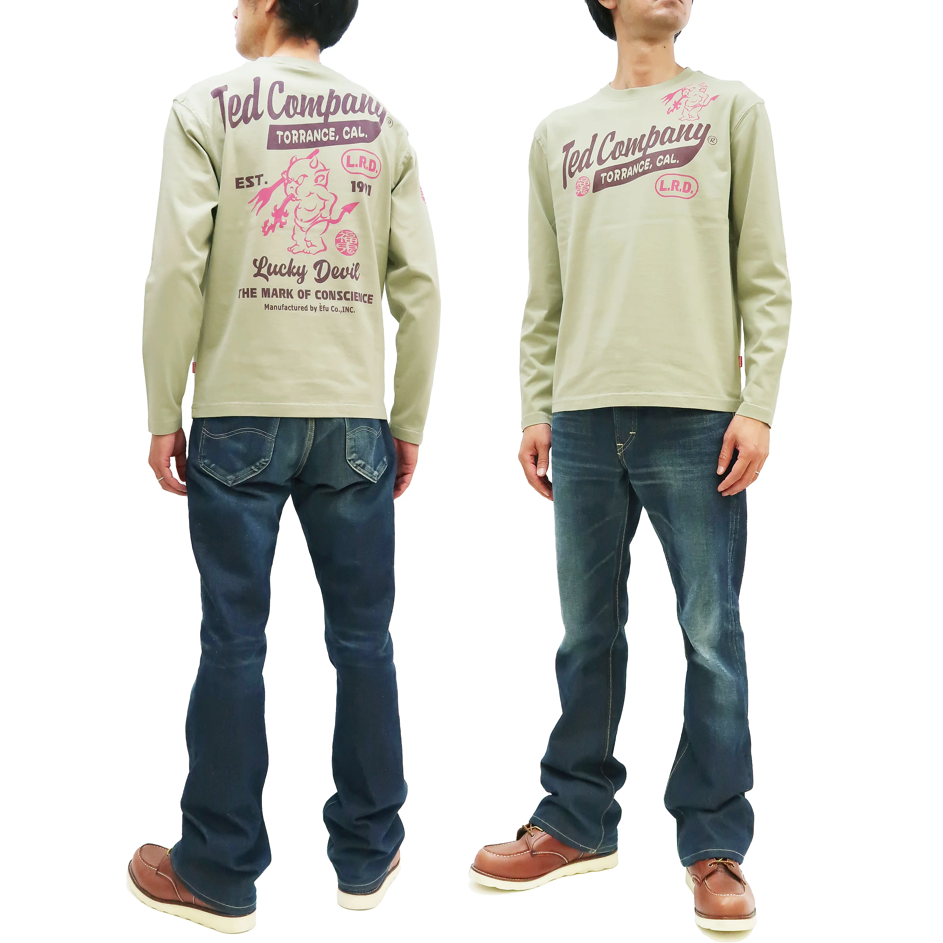 This graphic long sleeve T-shirt is produced by Tedman (Tedman's / Ted Company) and made in China. The Tedman brand, a division of Efu-Shokai in Tokyo, is a Japanese clothing brand. Tedman's clothing and accessories are introduced mascot graphic "Lucky devil" named Tedman into casual clothing making. Tedman (lucky red devil) is said to be derived from the US military squadron insignia (squadron emblems) during the world war II. And It is said that bad luck is blown off by the flames blowing out from tedman's mouth. And tedman brand use lucky devil named Tedman as their mark which makes this brand more unique. This long sleeve T-shirt is outfitted with the Tedman's brand own detailing, a contemporary interpretation and a modernize fit for a more casual look and fashion purpose. Made of 100% cotton one washed mediumweight preshrunk jersey knit. And this T-shirt is decorated with the discharge printing. The graphic on this T-shirt is based on the Tedman's logo. This product is made for Japanese market and made for Japanese clothing sizes. And This Tedman's T shirt is cut to wear as a regular fit (Not too slim or Not too loose) with short in the body length for a more fashion-forward looks. This long sleeve graphic T-shirt is new original creations by Tedman ( Tedman's Ted Company ) from Efu-Shokai.
